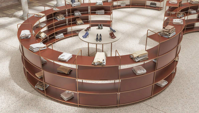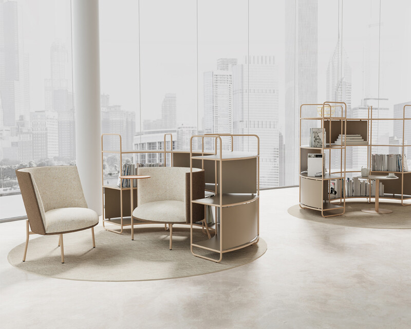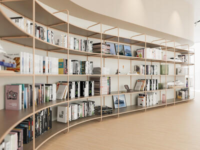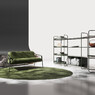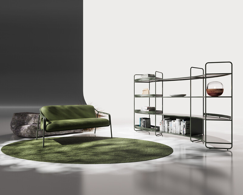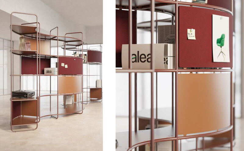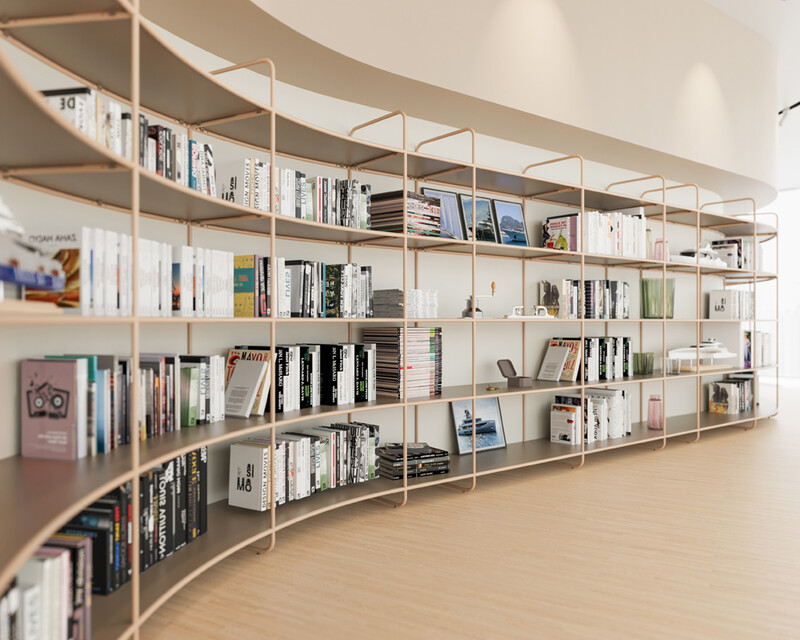 Inovativní a dynamický regálový systém s nekonvenčním designem, který se vyznačuje lineárními a zakřivenými policemi, které harmonicky protínají elegantní kovovou trubkovou konstrukci. Jeho modularita a volnost kompozice umožňují vertikální i horizontální rozšíření,